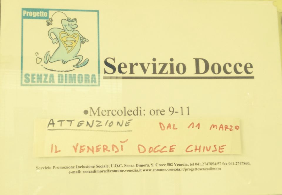 Contrariamente a quanto dichiarato, a pochi giorni dalla Commissione è stato affisso all’ingresso del servizio docce dedicato ai senza dimora un cartello che prevede la chiusura a partire dal giorno 11 marzo di una delle due giornate della settimana fino ad ora dedicate, in particolare quella del venerdì (come da foto allegata),