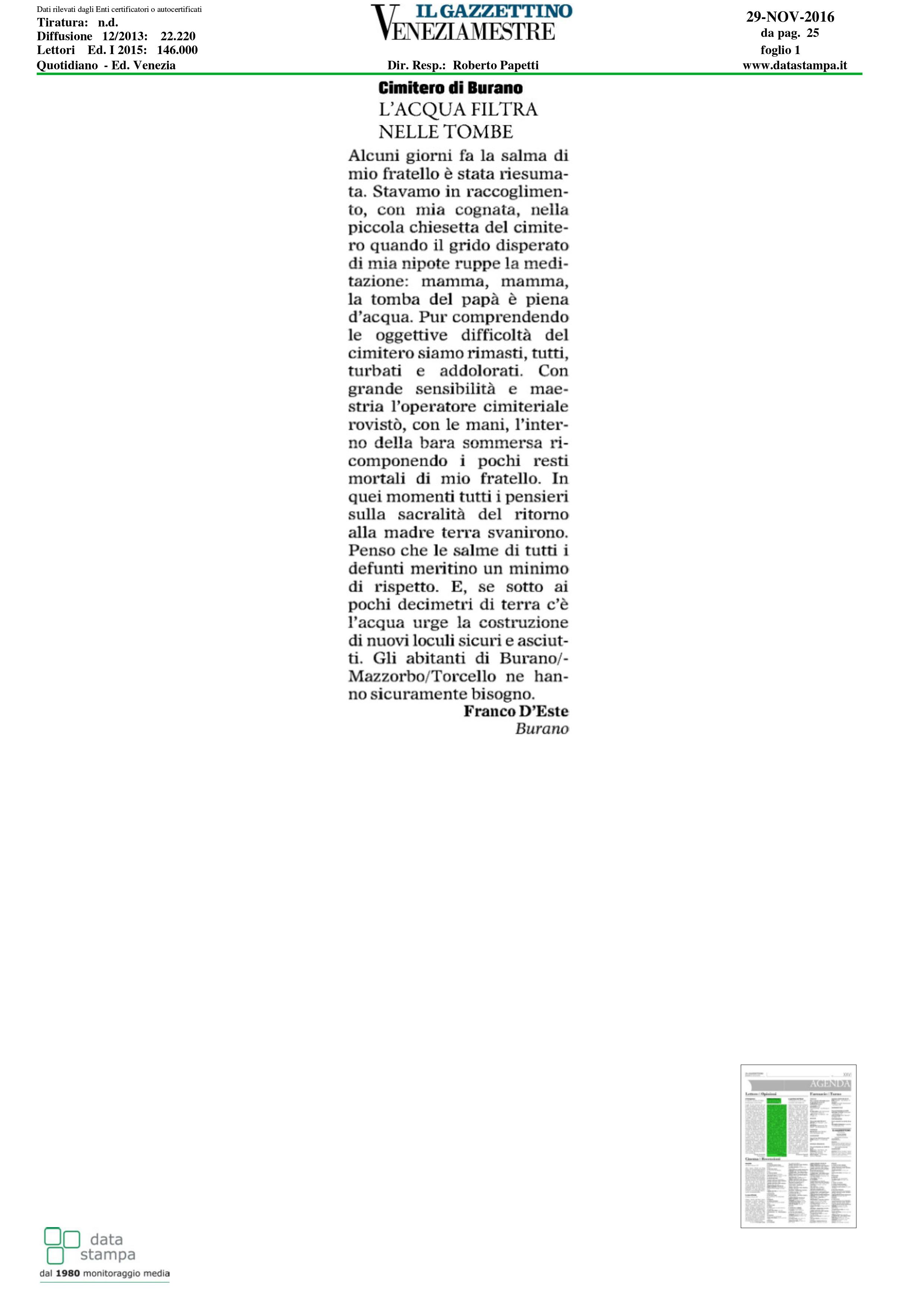 la lettera apparsa sulla stampa locale a firma del sig. D'Este ( in allegato) circa un episodio di infiltrazione d'acqua nella fossa di tumulazione del fratello presso il Cimitero di Mazzorbo;